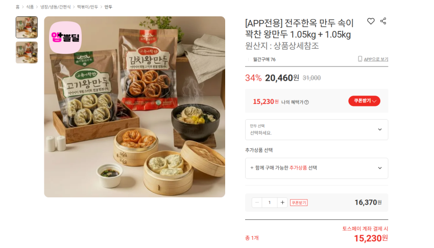 | 롯데온 | 전주한옥만두 왕만두 1.05kg + 1.05kg | 15,230원 | 핫딜모음에서 제공한 가격 |