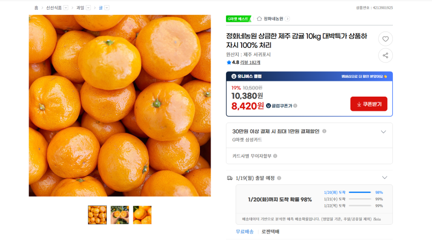 | G마켓 | 제주 감귤 10kg 중대과 | 9,720원 | 핫딜모음에서 제공한 가격 |