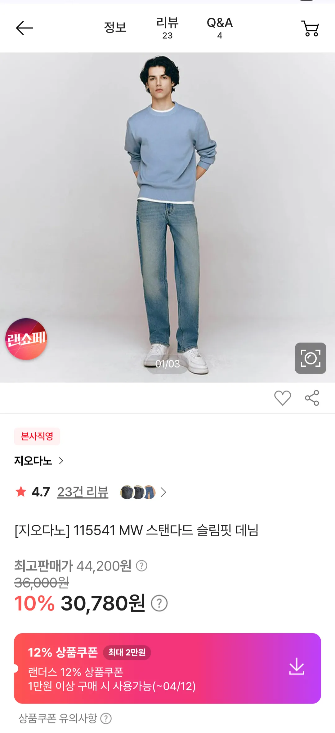 | 롯데온 | 지오다노 115541 MW 스탠다드 슬림핏 데님 | 36,000원 | 20% 할인 적용 가격 |