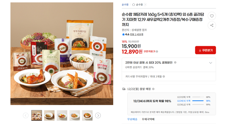 | G마켓 | 채담카레 160g 5+5개 (10팩) + 새우갈릭 카레 2팩 총 12팩 | 12,890원 | 핫딜모음에서 제공한 가격 |