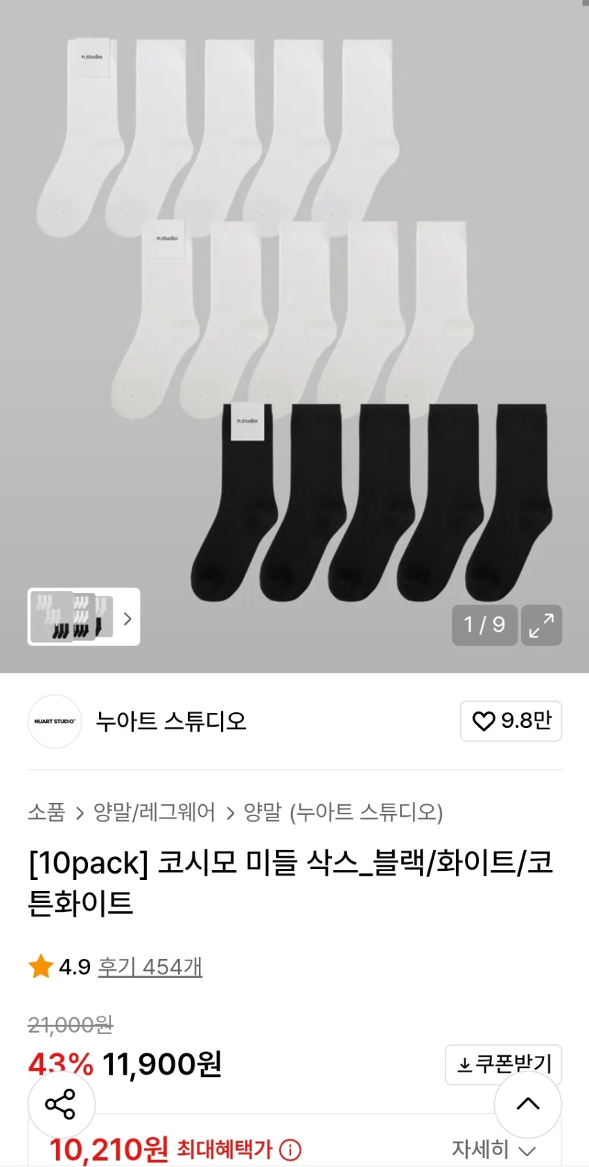 | 29CM | [10pack] 코시모 미들 삭스_블랙/화이트/코튼화이트 | 11,900원 (동일 구성으로 추정) | 동일 모델 10팩 구성, 무신사와 동일 가격대로 판매 추정 |