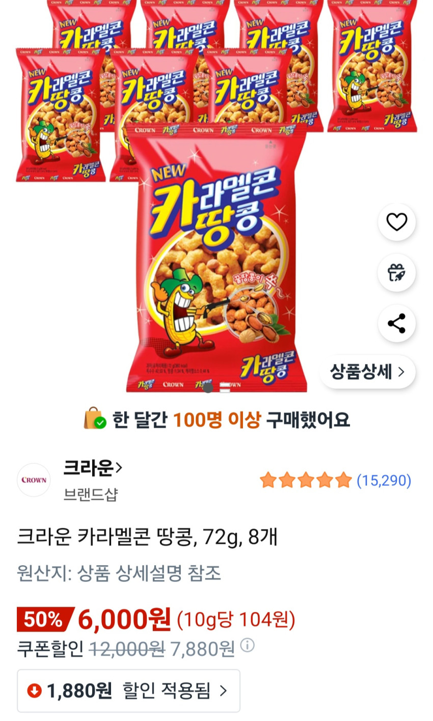 | 쿠팡 | 크라운 카라멜콘 땅콩, 72g, 8개 | 6,000원 | 핫딜모음에서 제공한 가격 |