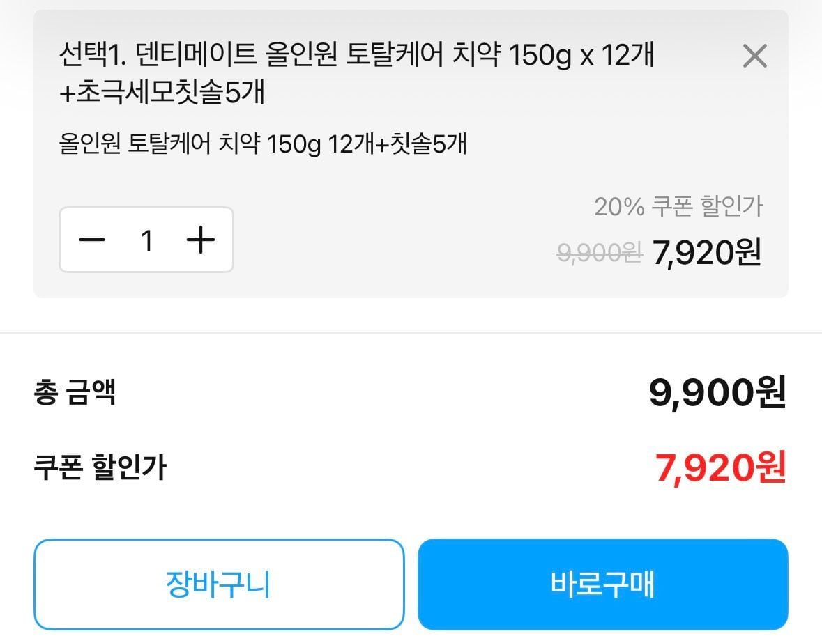 20% 쿠폰 적용하면 7,920원이고 150g 치약 1개에 600원대임