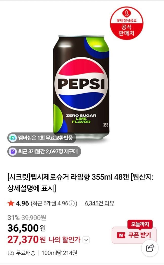 | 쿠차 | 롯데 펩시콜라 제로슈거 라임 355ml 48캔(24캔x2박스) | 44,720원 | 판매가 |