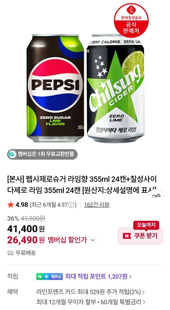 | 롯데칠성음료 공식 스토어 | 롯데칠성음료 펩시 제로 슈거 라임향 제로 카페인 355ml (48개) | 16,900원 | 구매 1만+ 기준 |