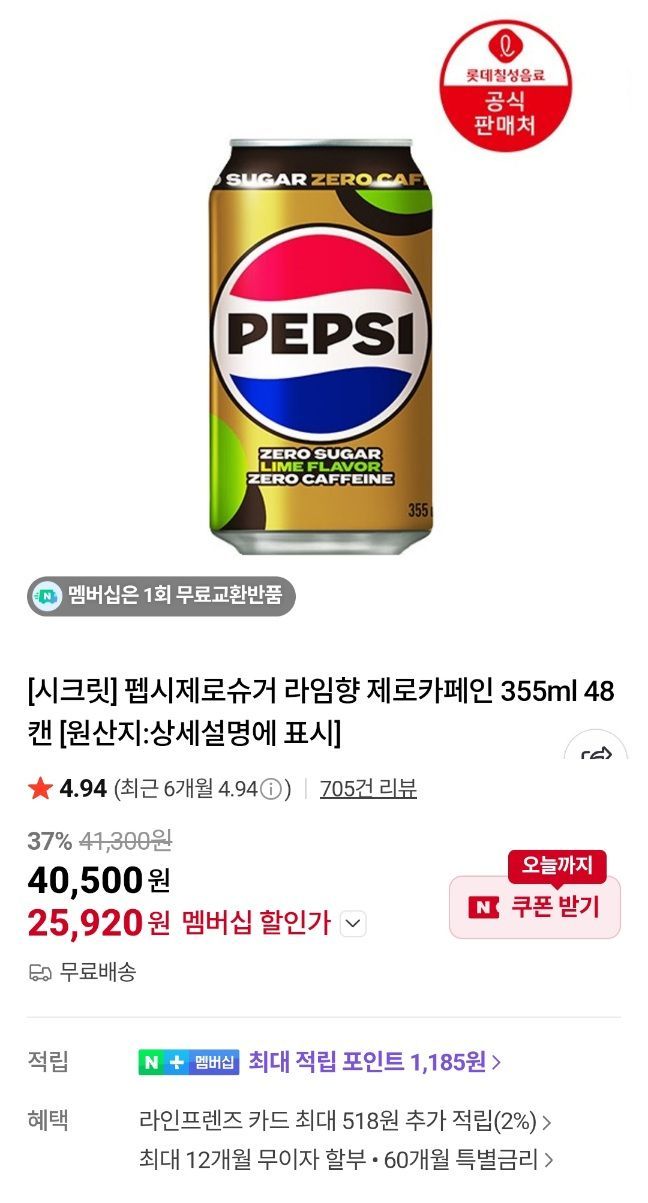 | 패션플러스 | 롯데 펩시콜라 제로슈거 라임 제로카페인 355ml x 48캔 | 30,970원 | 쿠폰할인가 (5% 상품쿠폰 적용) |