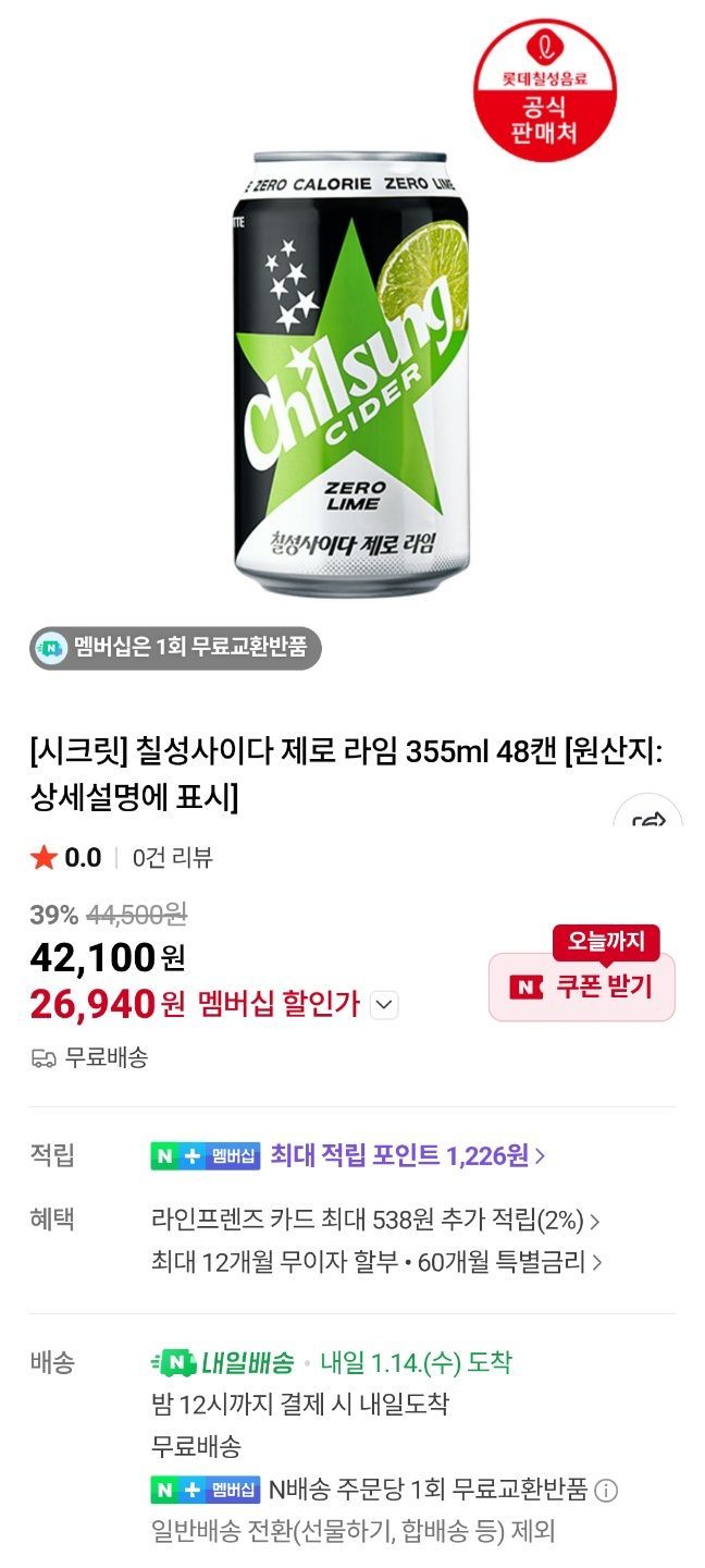 칠성사이다 제로 라임 48캔도 있음