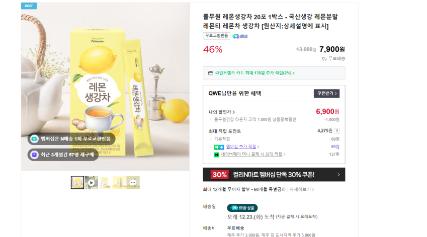 | 네이버 | 풀무원 레몬생강차 20포 1박스 | 6,900원 | 핫딜모음에서 제공한 가격 |