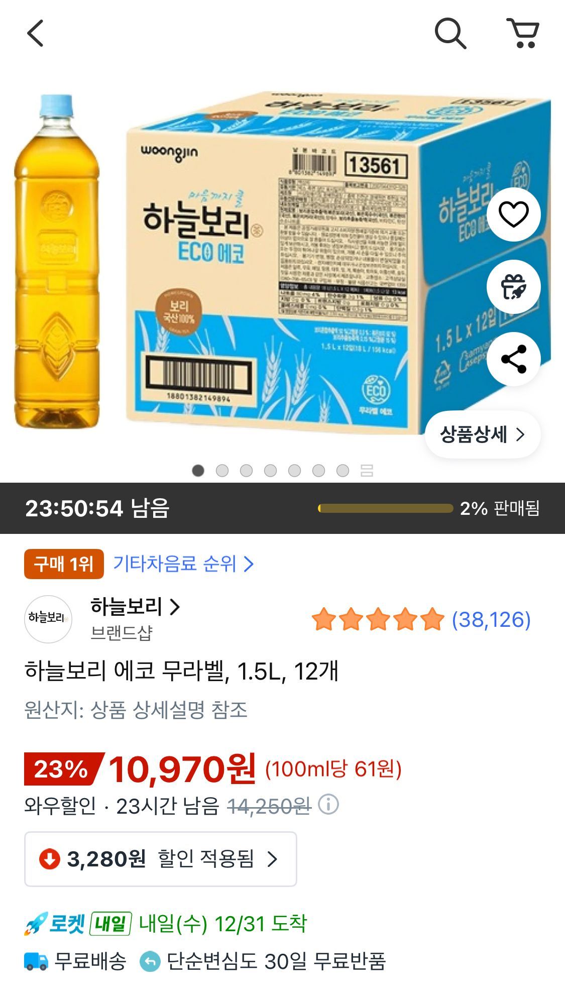 | 쿠팡와우 | 하늘보리 에코 무라벨, 1.5L, 12개 | 10,970원 | 핫딜모음에서 제공한 가격 |