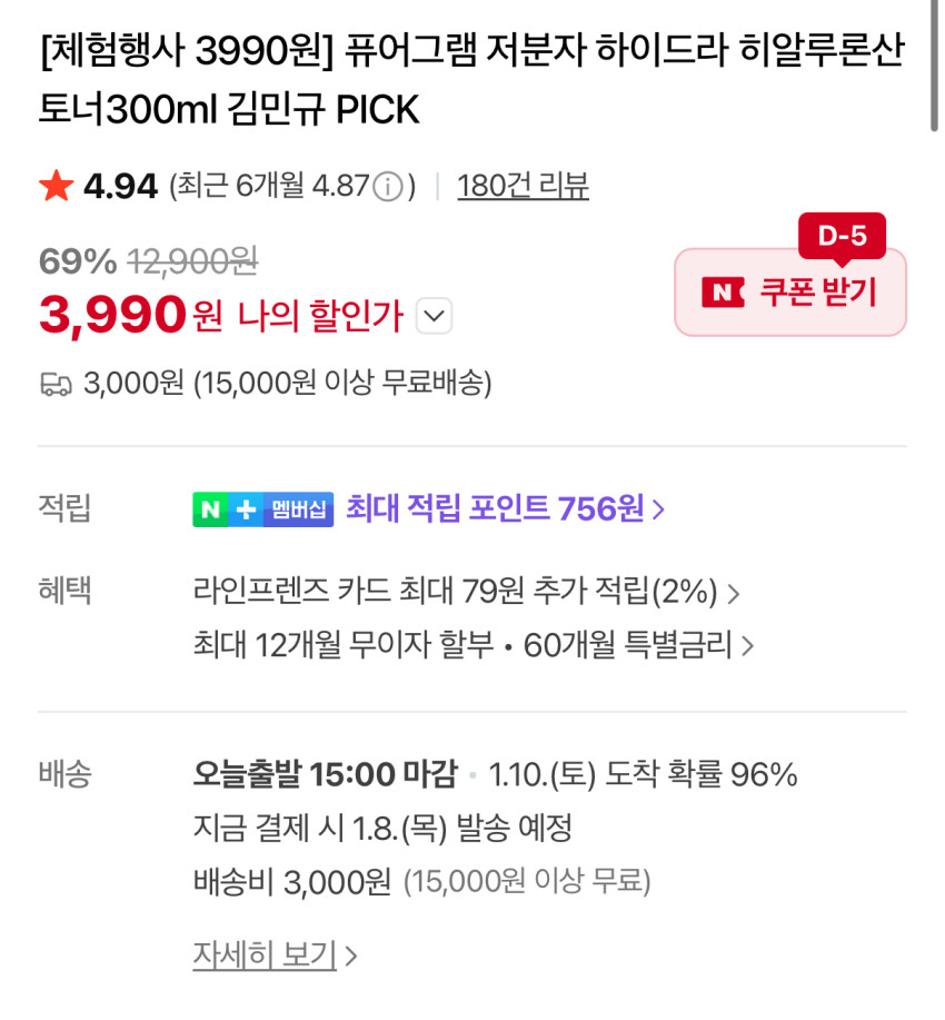 | 네이버 | 히알루론산 토너 300ml | 3,990원 | 핫딜모음에서 제공한 가격 |